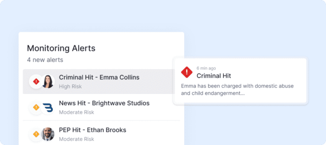 With thousands of integrated data sources, including PACER, our monitoring platform delivers real-time alerts on individuals & entities across adverse media, federal & local civil litigation, criminal & bankruptcy records, sanctions & enforcements, political exposure, and sex offender registries.